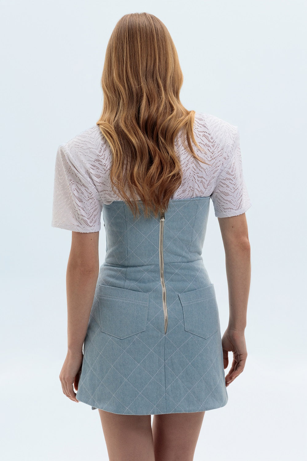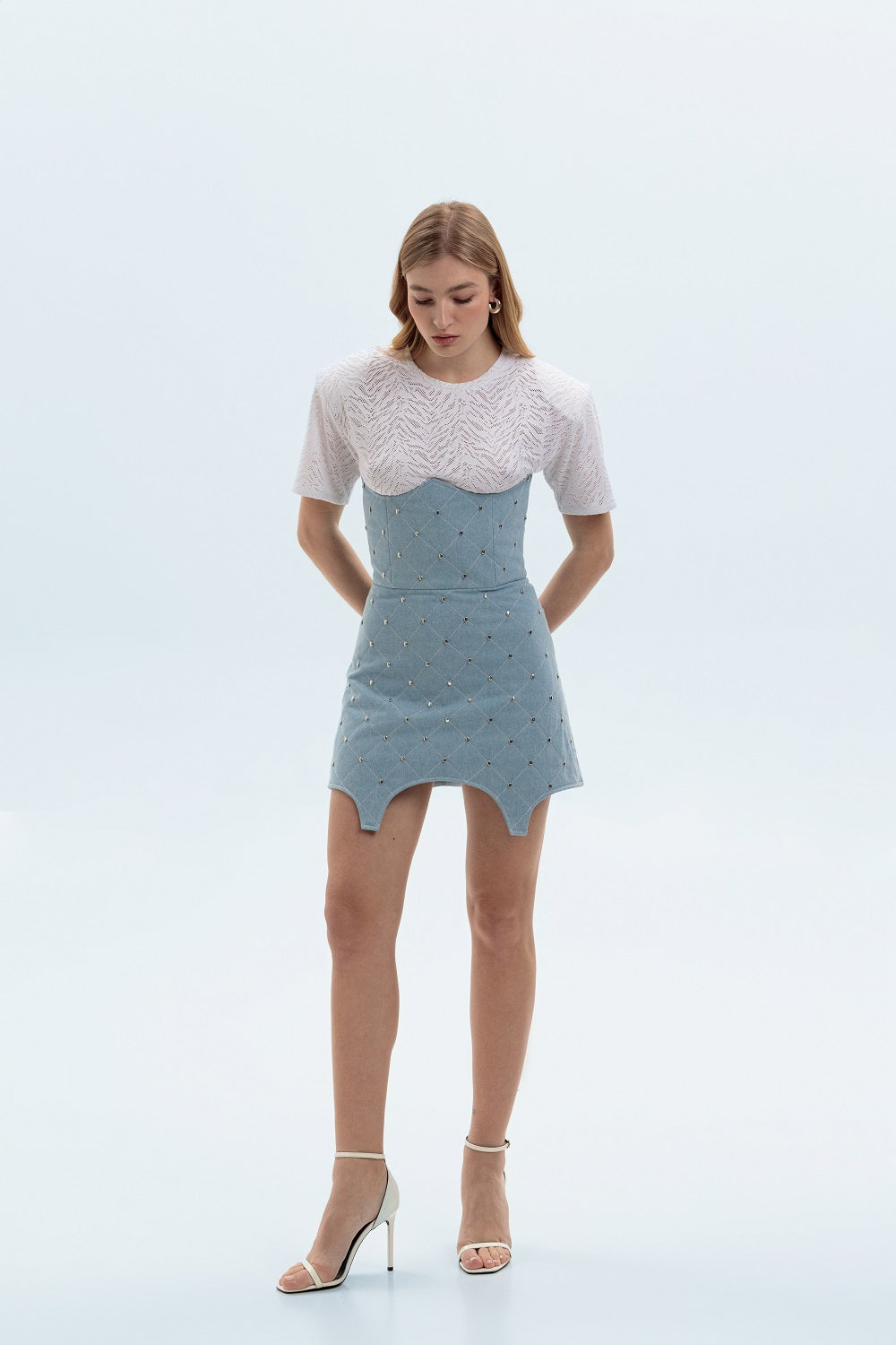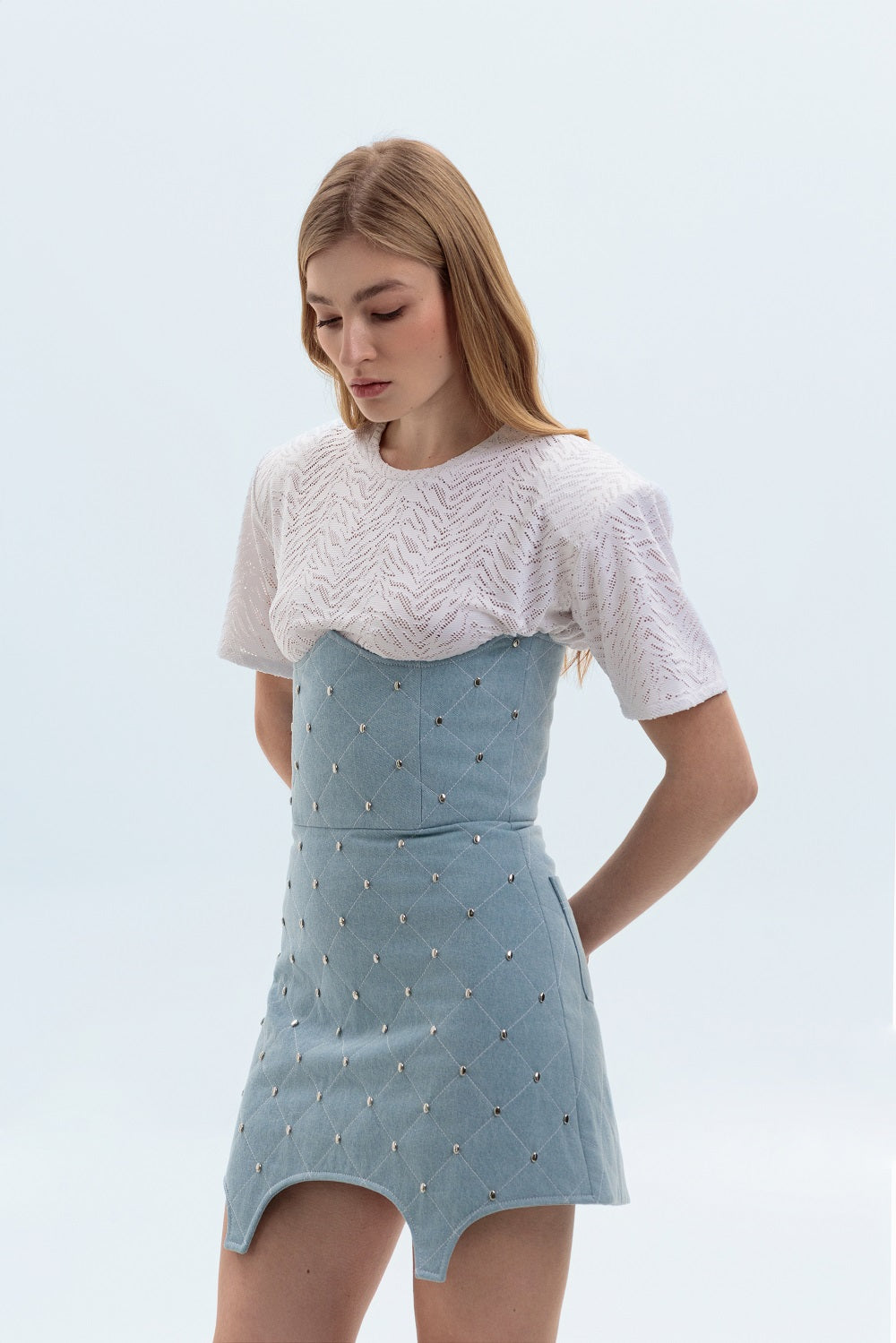 A modern twist on denim, this corset-style skirt sculpts the silhouette while adding edgy sophistication.