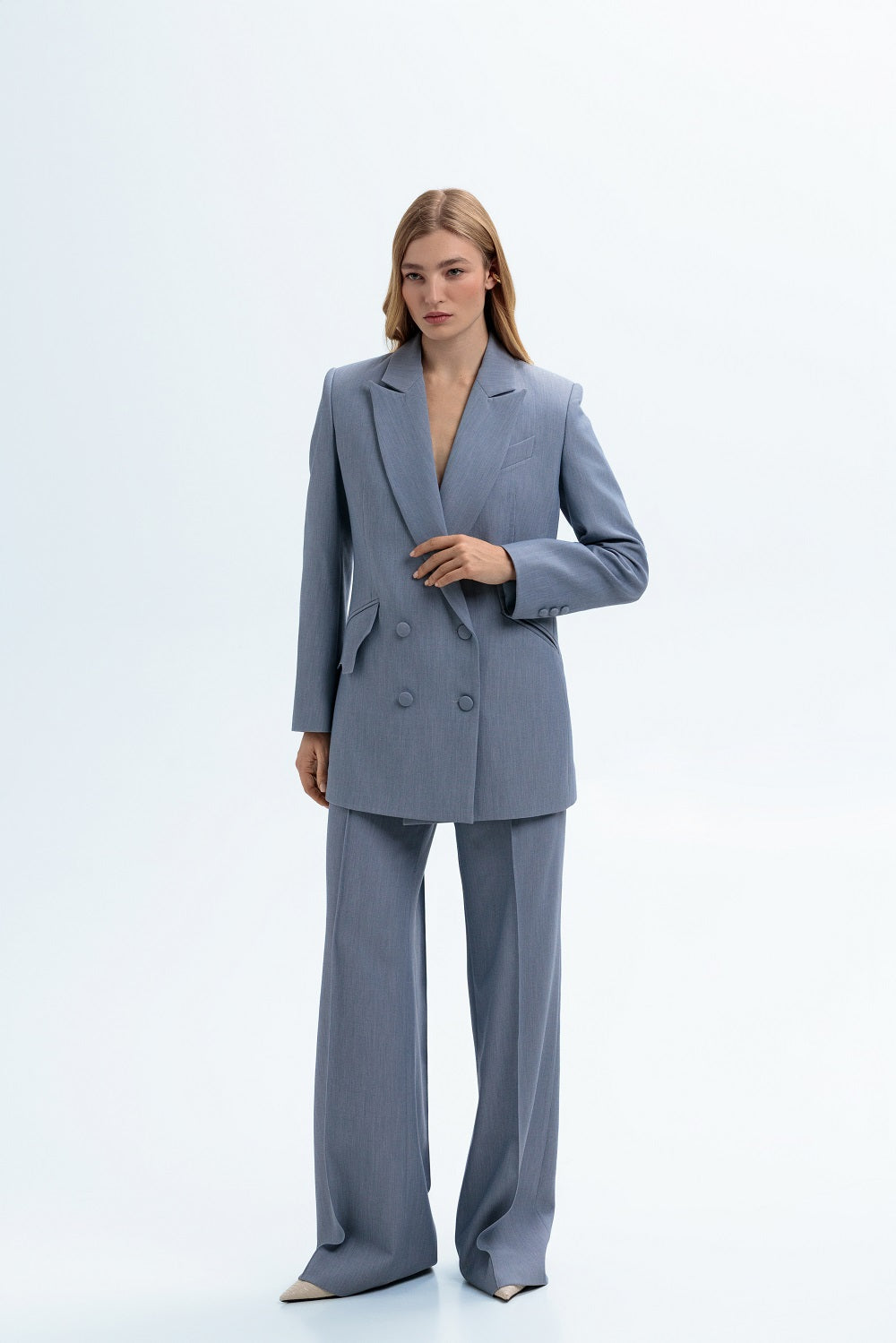 Sophisticated and tailored, this double-breasted jacket exudes timeless elegance and power.