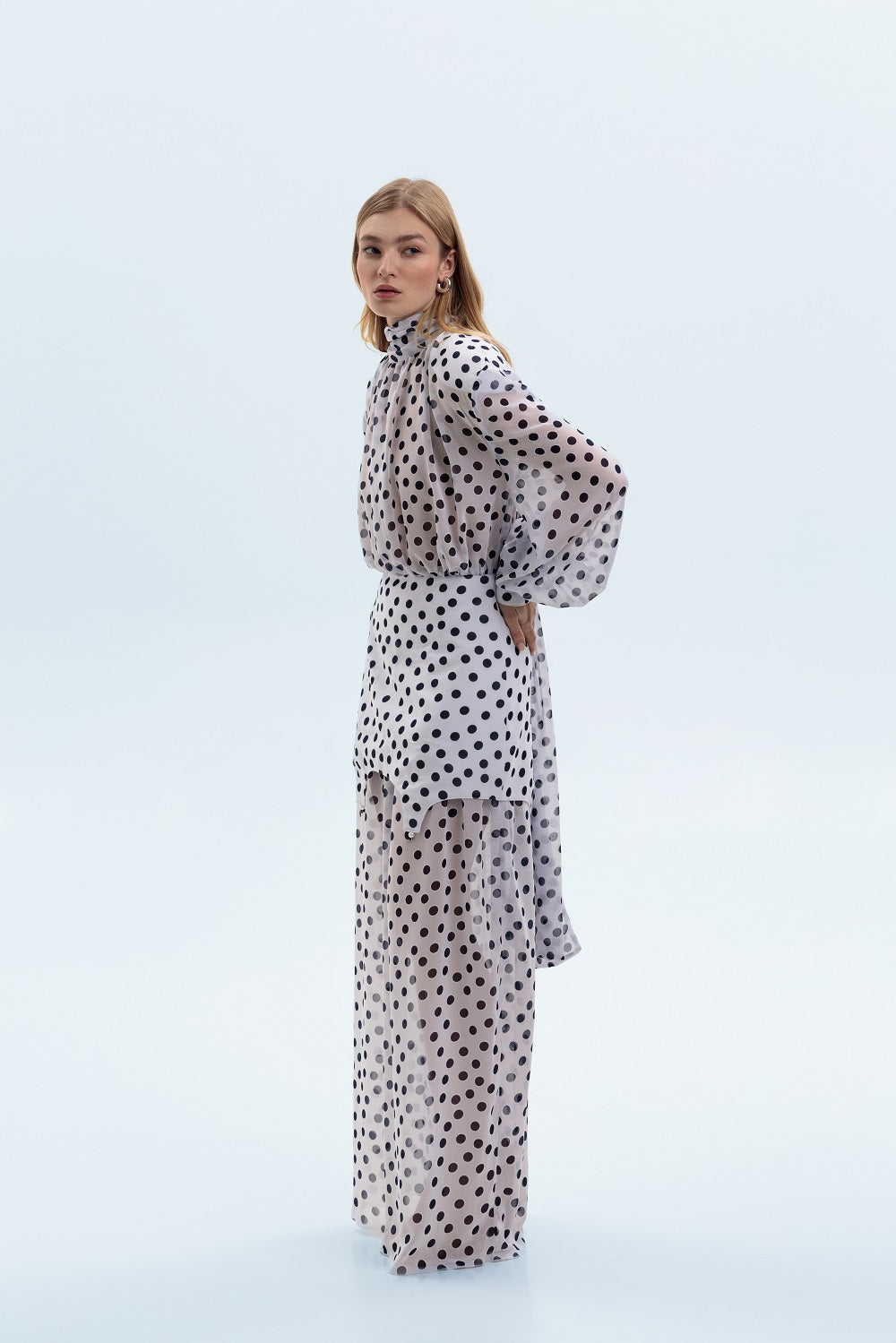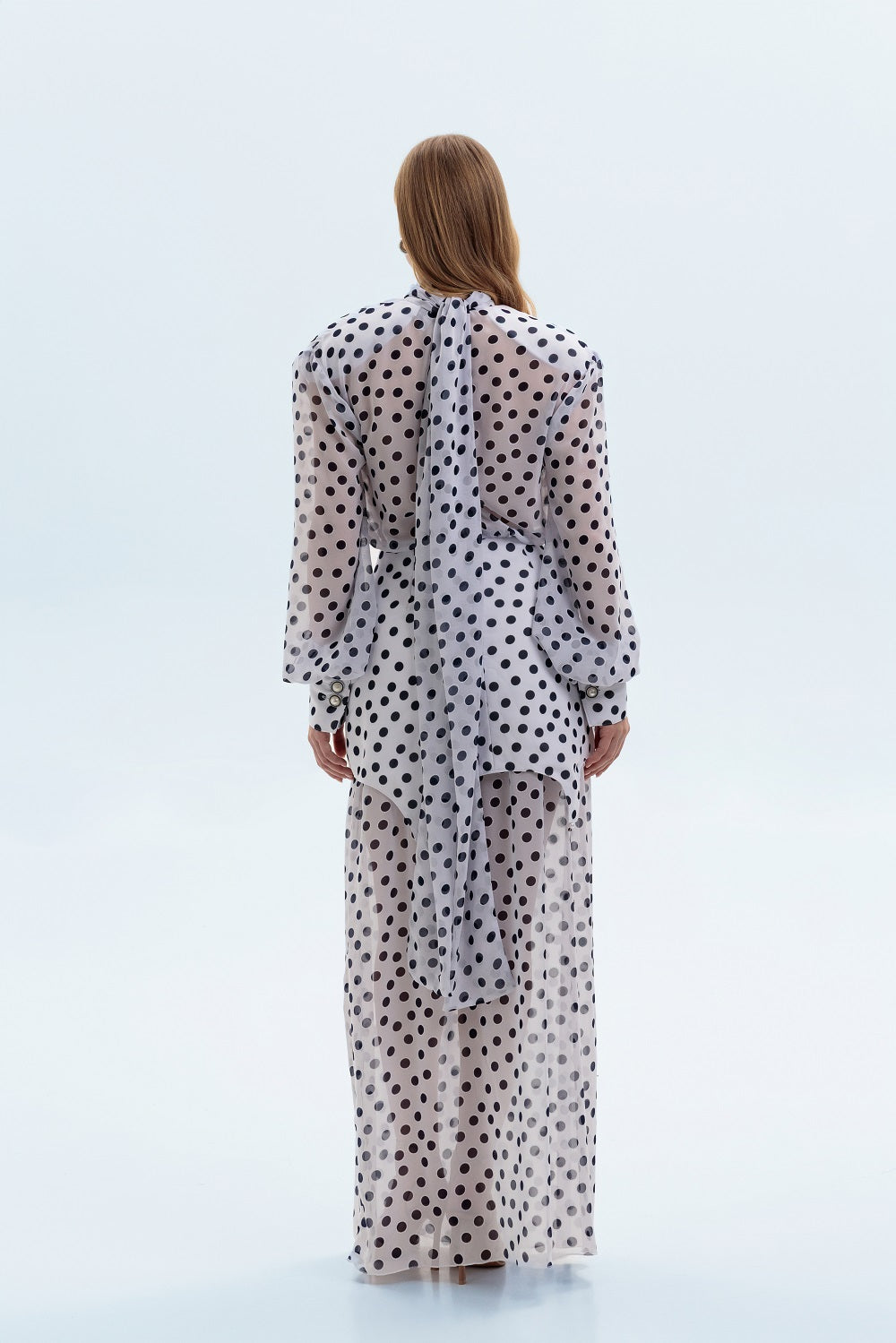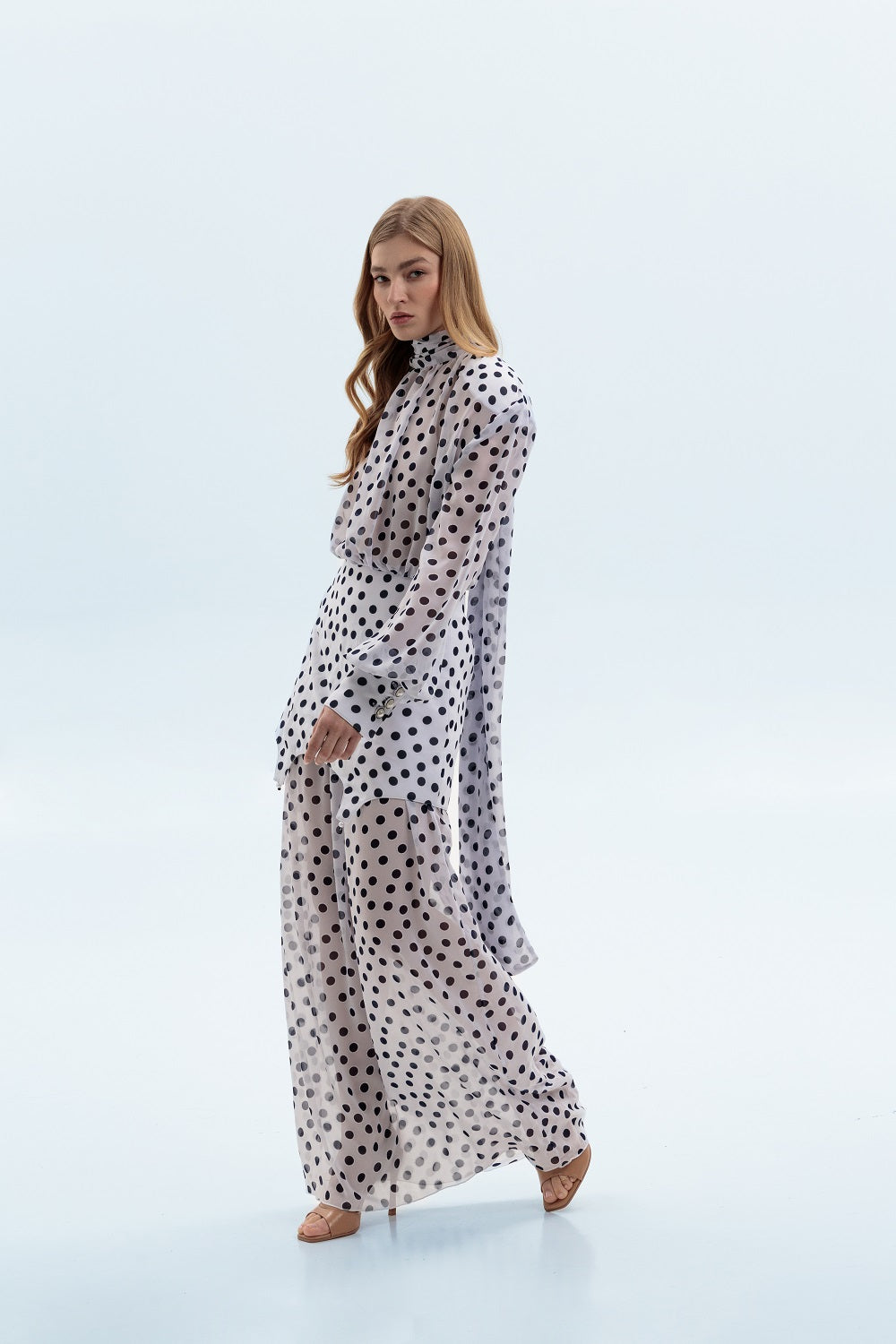 Elegant and flowing, this maxi dress in timeless polka dots creates a sophisticated, statement-making look.