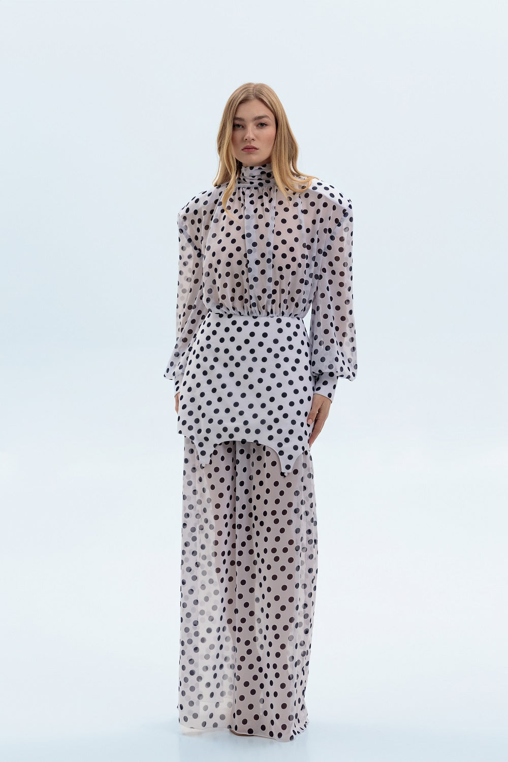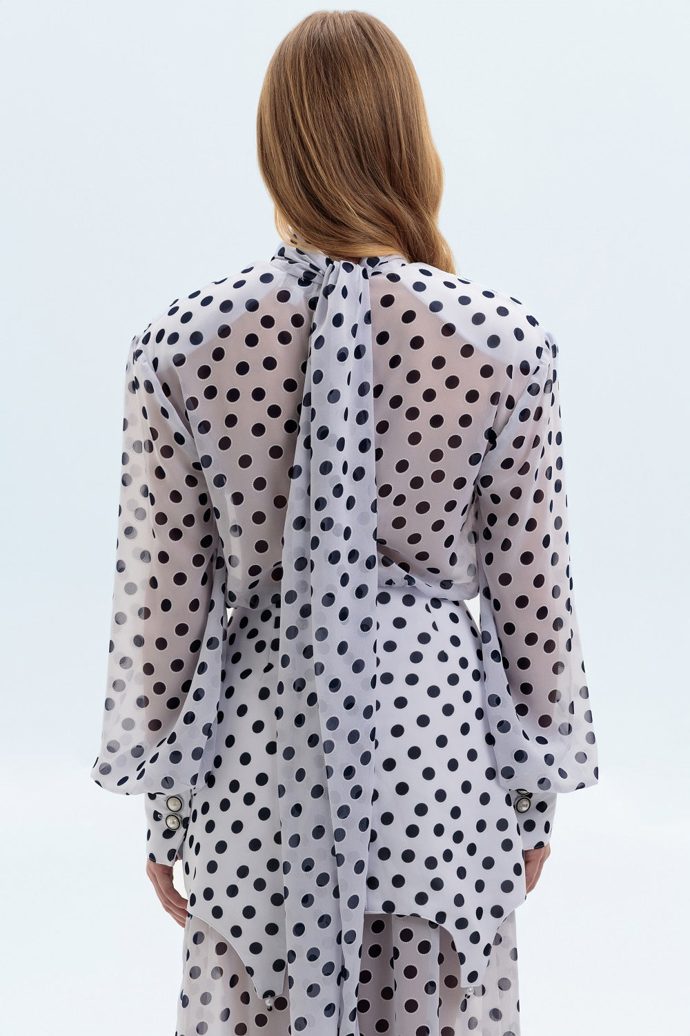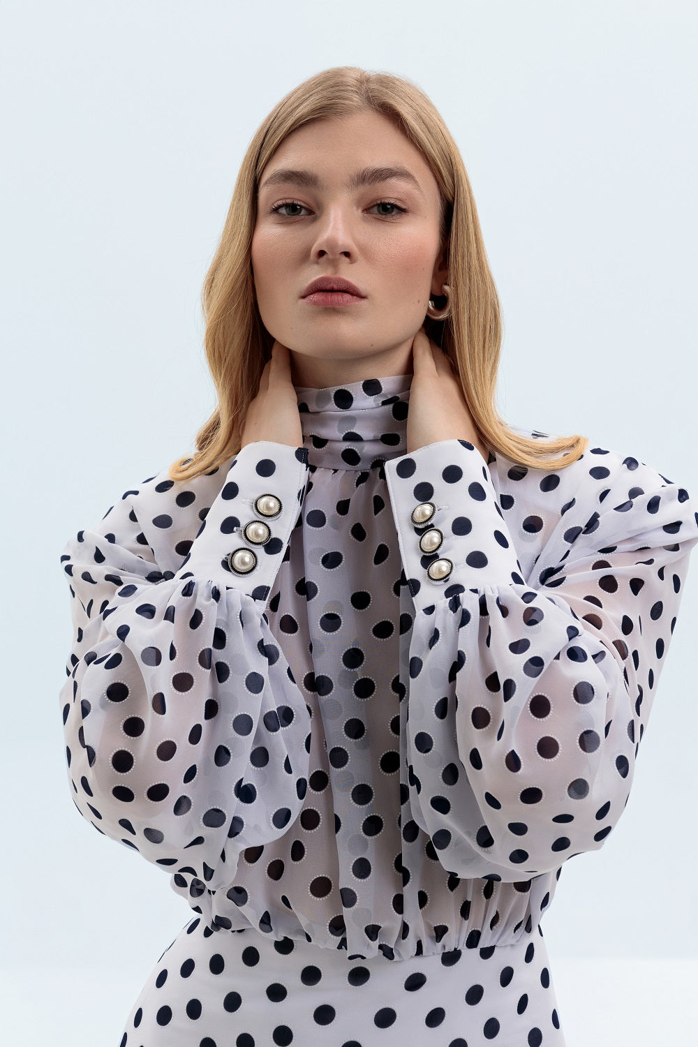 Elegant and flowing, this maxi dress in timeless polka dots creates a sophisticated, statement-making look.