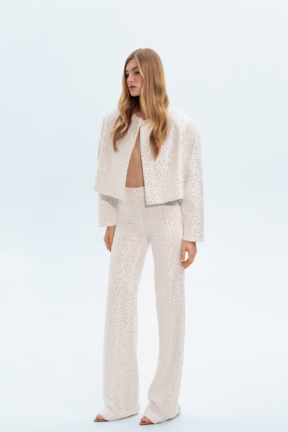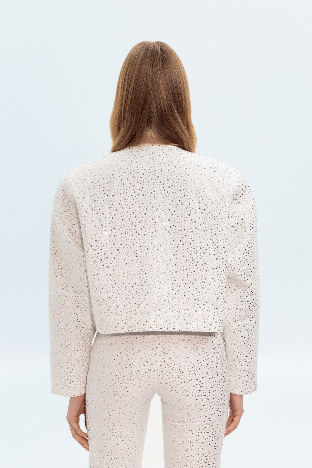 Add a modern sparkle to your wardrobe with this shiny denim jacket, perfect for a chic, casual look.