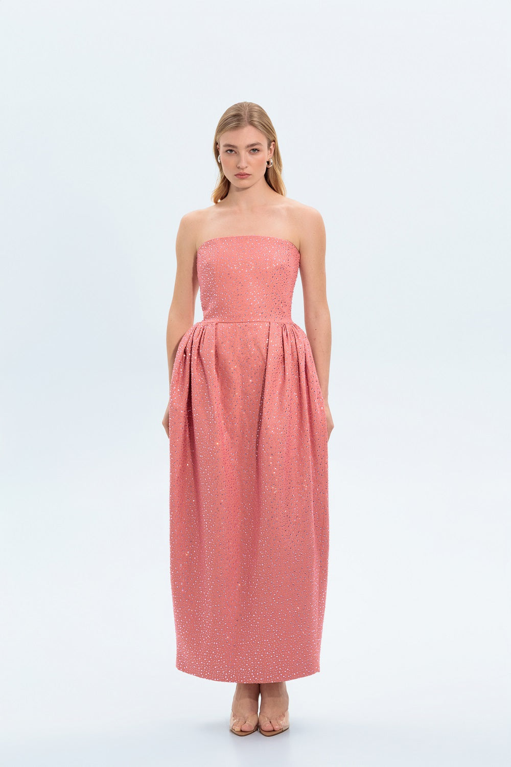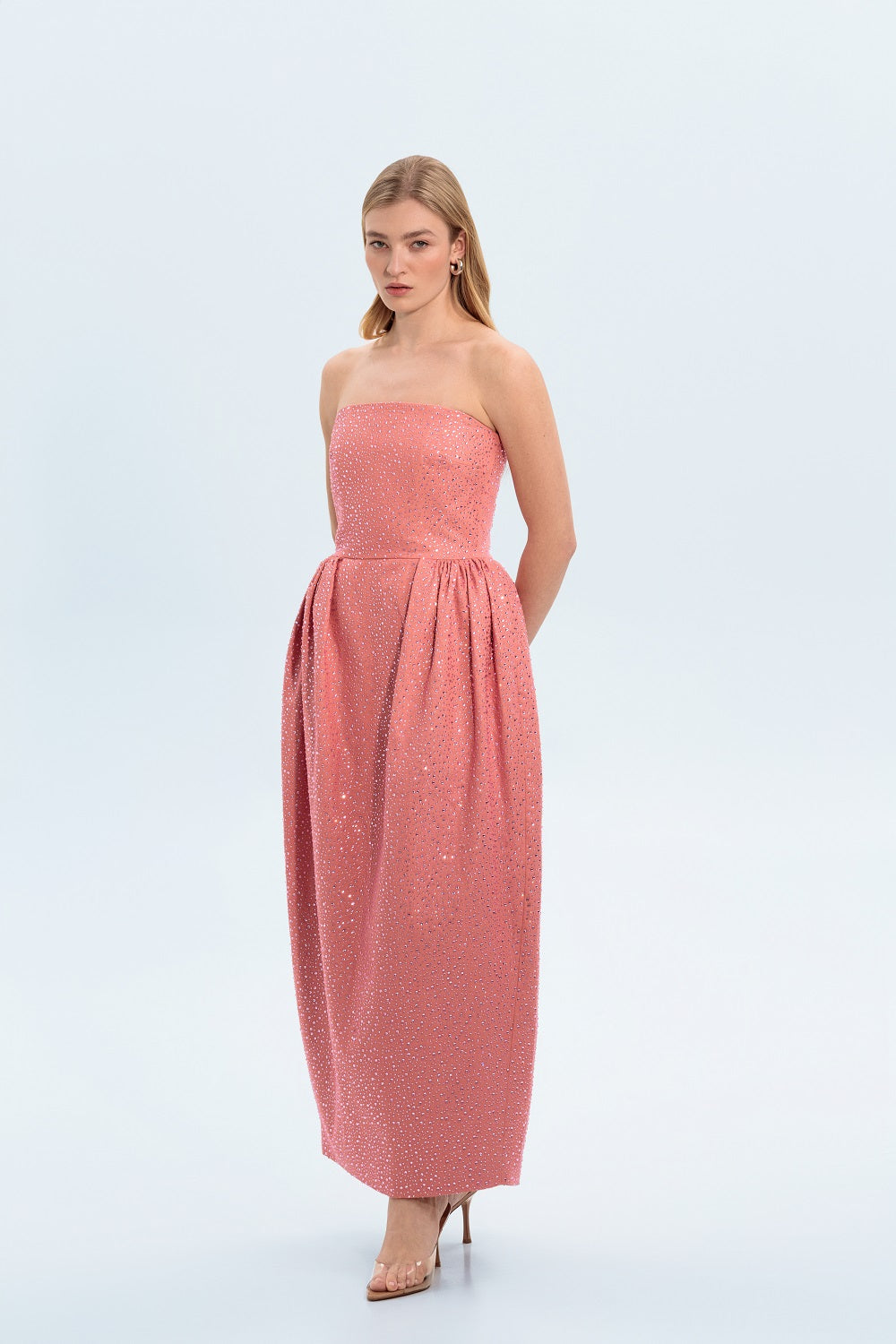 Effortless elegance meets modern shine in this denim maxi dress, designed for a chic, standout look.